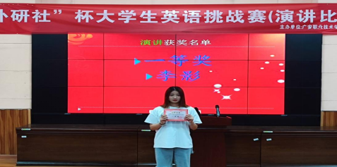 比赛中选手们准备充分,尽情投入,大胆表现,充分展示自己的英语专业水平和演讲技能。同学们准确的发音,洪亮的嗓音,流利的口语,优美的体态,带动了演讲的气氛,赢得了一阵阵喝彩和掌声。最后,英语教研室主任、副教授李小蓉对选手们的整体表现进行了点评,同时也为同学们提出了有益的英语学习建议。经过精彩的角逐,李影同学获得了本次演讲比赛一等奖。