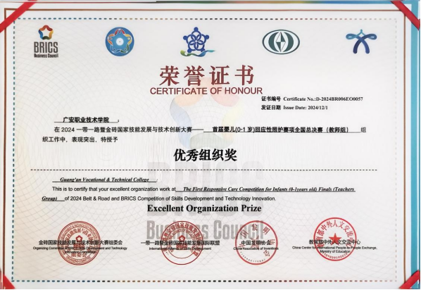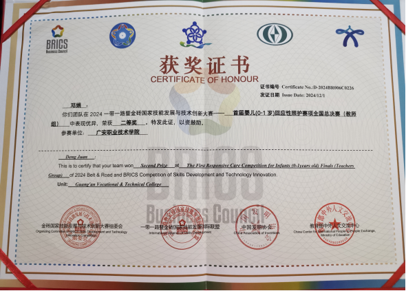 11月28日-12月1日,2024一带一路暨金砖国家技能发展与技术创新大赛——全国首届婴儿(0-1岁)回应性照护赛项(全国总决赛)在内蒙古自治区兴安盟市举行,永利yl23411教师邓娟喜获教师组二等奖。