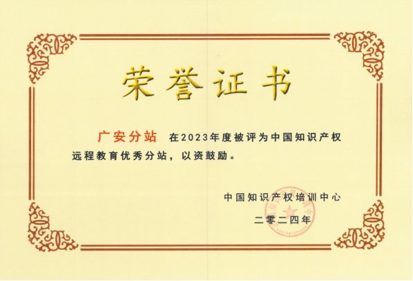 近日,中国知识产权培训中心公布了中国知识产权远程教育总平台对2023年度全国各分站的考核评估结果,永利yl23411分站(以下简称广安分站)在全国188个分站中位列第15名,获全国“优秀分站”荣誉称号。